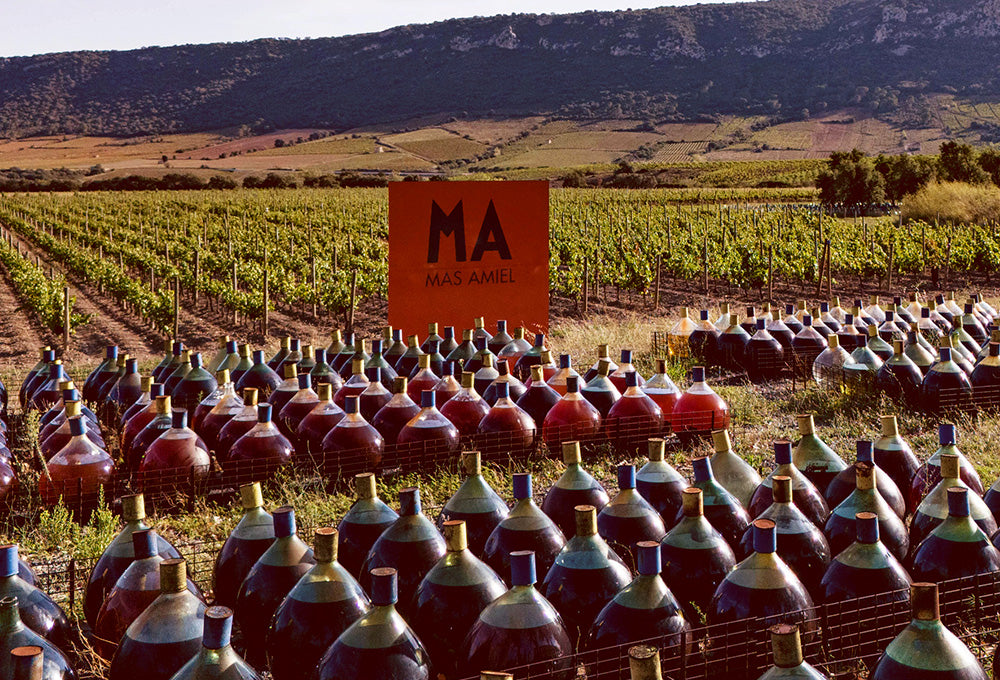 Élevage d’une année en bonbonnes de verre placées à l'extérieur, puis en foudres de chêne de 350 hl. Cet élevage est la véritable signature du Mas Amiel.